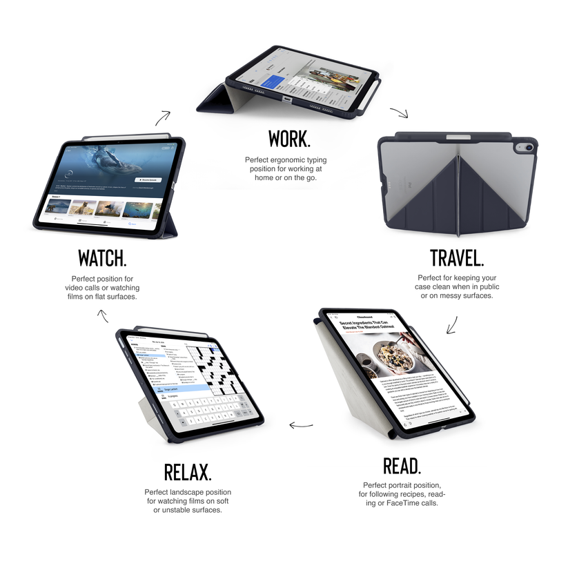 L'Original Origami, l'étui iPad le plus populaire avec Pencil case, n'a pas son pareil pour améliorer l'expérience de votre iPad, grâce à son design pliable 5-en-1. Il est également très efficace pour protéger votre appareil grâce à sa coque TPU absorbant les chocs, ses poches d'air internes et sa couverture avant magnétique.