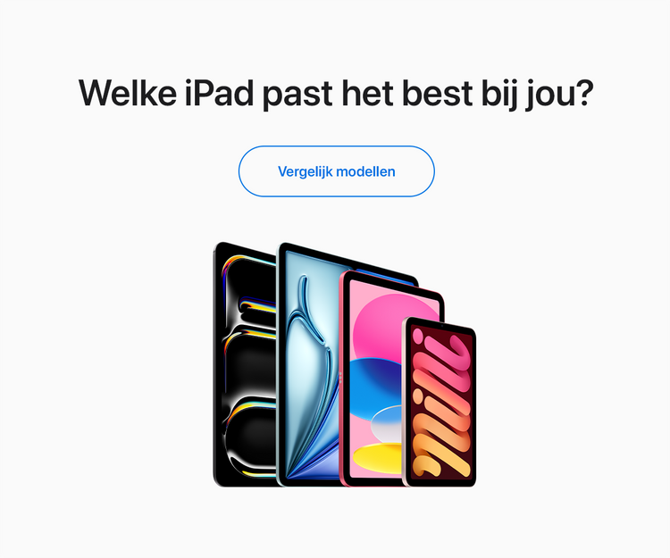 Indrukwekkende Retina-displays. Krachtige chips die geen enkele moeite hebben met grafisch veeleisende games en apps. Geavanceerde camera’s aan de voor-en achterkant. Simpele en veilige authenticatie en Apple Pay. Supersnelle draadloze verbindingen. Een batterij die de hele dag meegaat. Apple Pencil en iPad-toetsenborden voor eindeloze extra mogelijkheden. En iPadOS met meer dan een miljoen apps in de App Store. Welke iPad je ook kiest, je profiteert altijd van z’n unieke veelzijdigheid, draagbaarheid en eenvoud.