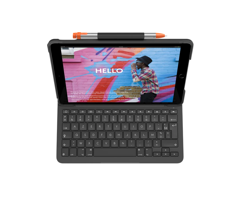 Met de Slim Folio-hoes met geïntegreerd Bluetooth-toetsenbord van Logitech kun je op je iPad (7e/8e/9e generatie) typen zoals op een laptop. Waar je ook bent. Dankzij het slanke, lichte design is deze alles-in-één-hoes gemakkelijk te gebruiken en mee te nemen, en beschermt deze je iPad ook tegen stoten, krassen en morsen. De Slim Folio houdt je iPad daarnaast onder de perfecte hoek om erop te typen of te tekenen en blijft op elk oppervlak op zijn plek.